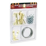 - Complete 50-piece kit includes heavy duty hooks, hangers, wire and eye screws for multiple pictures